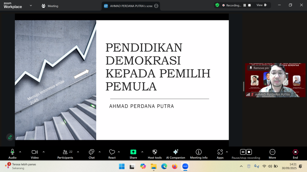 KPU Kota Parepare berhasil menggelar webinar bertajuk “Membangun Pemilih Pemula yang Berdaulat melalui Pemilihan Ketua OSIS Serentak Tahun 2025”, yang dilaksanakan secara daring melalui platform Zoom Meeting. Kegiatan ini merupakan bagian dari upaya untuk meningkatkan pemahaman dan kesadaran demokrasi bagi para pelajar sebagai pemilih pemula. Webinar dibuka secara resmi oleh Anggota KPU Provinsi Sulawesi Selatan, Hasruddin Husain. Dalam sambutannya, Hasruddin menegaskan bahwa pelaksanaan Pemilihan Ketua OSIS secara serentak adalah langkah strategis yang dilakukan KPU Provinsi Sulawesi Selatan bersama Dinas Pendidikan Provinsi dan Bawaslu di 24 kabupaten/kota, guna mewujudkan pendidikan bagi pemilih pemula secara berkelanjutan sekaligus sebagai bahan evaluasi untuk terus memperbaiki kualitas demokrasi di tingkat sekolah. Ia juga menekankan pentingnya proses pemilihan yang transparan dan adil sebagai pondasi pembentukan pemilih berdaulat di masa depan. Acara ini menghadirkan narasumber berkompeten, yaitu Susilawati Muharram, Anggota Badan Pengawas Pemilu (Bawaslu) Kota Parepare, serta Ahmad Perdana Putra, Ketua Divisi Sosialisasi Pendidikan Pemilih, Partisipasi Masyarakat, dan Sumber Daya Manusia (Sosdiklih, Parmas, SDM) KPU Kota Parepare. Kedua narasumber menyampaikan materi mengenai pentingnya pendidikan bagi pemilih pemula, evaluasi mekanisme pemilihan Ketua OSIS, serta peran aktif pemilih pemula ke depan dalam hal pengawasan untuk mencegah pelanggaran dan menjaga integritas pemilihan yang sesungguhnya. Peserta webinar terdiri dari para guru serta siswa-siswi yang menjadi panitia penyelenggara Pemilihan Ketua dan Wakil Ketua OSIS tingkat SMA dan SMK se-Kota Parepare. Turut hadir pula Ketua dan anggota KPU Kota Parepare. Melalui webinar ini, para peserta memperoleh pemahaman yang lebih mendalam tentang pentingnya partisipasi aktif dalam demokrasi, khususnya dalam konteks pemilihan OSIS sebagai wadah pembelajaran demokrasi sejak dini. Selain itu, kegiatan ini diharapkan dapat mendorong siswa menjadi pemilih yang cerdas, bertanggung jawab, dan berdaulat dalam menggunakan hak pilih mereka. KPU Kota Parepare berkomitmen untuk terus mendukung pelaksanaan pemilihan Ketua OSIS serentak di tahun-tahun mendatang demi mewujudkan pemilihan yang berkualitas dengan mengedepankan asas transparansi, akuntabilitas, dan keadilan, sehingga proses demokrasi di lingkungan pendidikan dapat berjalan sesuai harapan. ....