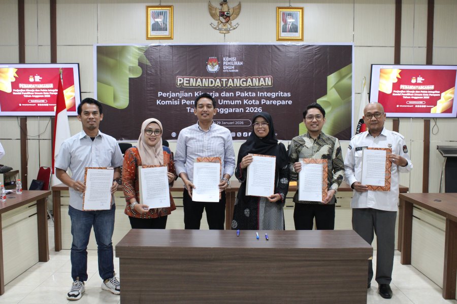 KPU Kota Parepare melaksanakan kegiatan Penandatanganan Perjanjian Kinerja Tahun 2026, Pakta Integritas, serta Komitmen Bersama Pembangunan Zona Integritas menuju Wilayah Bebas dari Korupsi (WBK) dan Wilayah Birokrasi Bersih dan Melayani (WBBM), Kamis (29/01/2026), bertempat di Aula Kantor KPU Kota Parepare. Kegiatan ini diikuti oleh Ketua dan Anggota KPU Kota Parepare, Sekretaris, para Kepala Sub Bagian, serta seluruh staf Sekretariat KPU Kota Parepare sebagai wujud penguatan akuntabilitas kinerja, integritas, dan komitmen bersama dalam memberikan pelayanan publik yang profesional, transparan, dan berintegritas. Melalui kegiatan ini, KPU Kota Parepare meneguhkan komitmen untuk terus meningkatkan kualitas tata kelola kelembagaan serta mendukung terwujudnya birokrasi yang bersih dan melayani. Dalam kegiatan Ketua KPU Kota Parepare menyampaikan Penandatanganan dilakukan sebagai bentuk komitmen bersama dalam mendukung pencapaian target kinerja organisasi, peningkatan kualitas layanan kelembagaan, serta penguatan tata kelola pemerintahan yang baik (good governance). Ungkapnya. Melalui Perjanjian Kinerja dan Pakta Integritas Tahun 2026 ini, KPU Kota Parepare berkomitmen untuk menjaga nilai-nilai integritas, netralitas, dan profesionalisme dalam setiap tahapan pelaksanaan tugas. ....