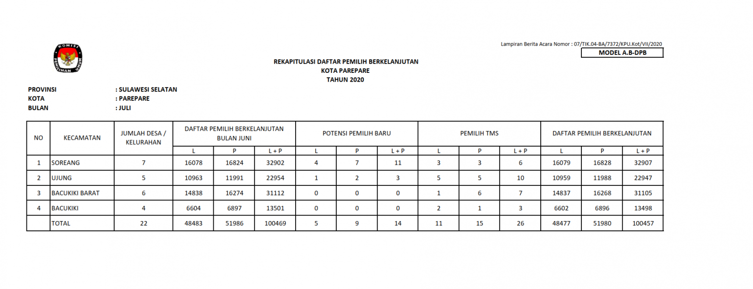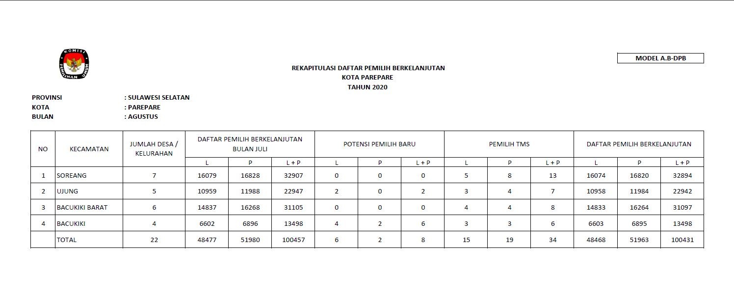 Sedangkan hasil pemutakhiran DPB periode Juli 2020 untuk Kota Parepare yang disetujui sebagai Berita Acara (BA) Nomor: 07 / TIK.04-BA /7372/KPU.Kot/VII/2020 adalah 100.469 penerima. Terdiri dari laki-laki 48.483 pemilih dan perempuan 51.986 pemilih. Sedangkan persebarannya Kecamatan Soreang laki-laki 16.078 orang dan perempuan 16.824, jumlah: 32902. Kecamatan Ujung laki-laki: 10.963 orang, perempuan: 11.911 orang, jumlah: 2.295 orang. Kecamatan Bacukiki Barat: laki-laki: 14.838 orang, perempuan: 16.274 orang. Jumlah: 31.112 orang. Kecamatan Bacukiki: laki-laki: 6.604 orang, perempuan: 6.897 orang, jumlah: 13.501 orang. ( kpu parepare / ed diR )