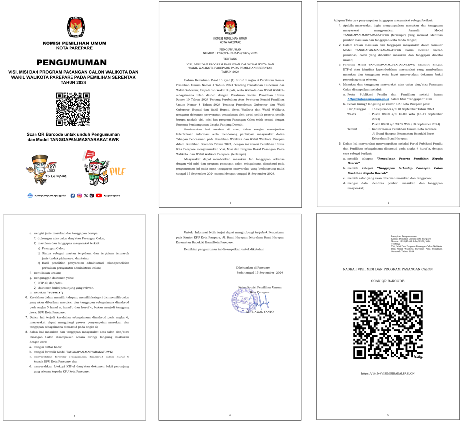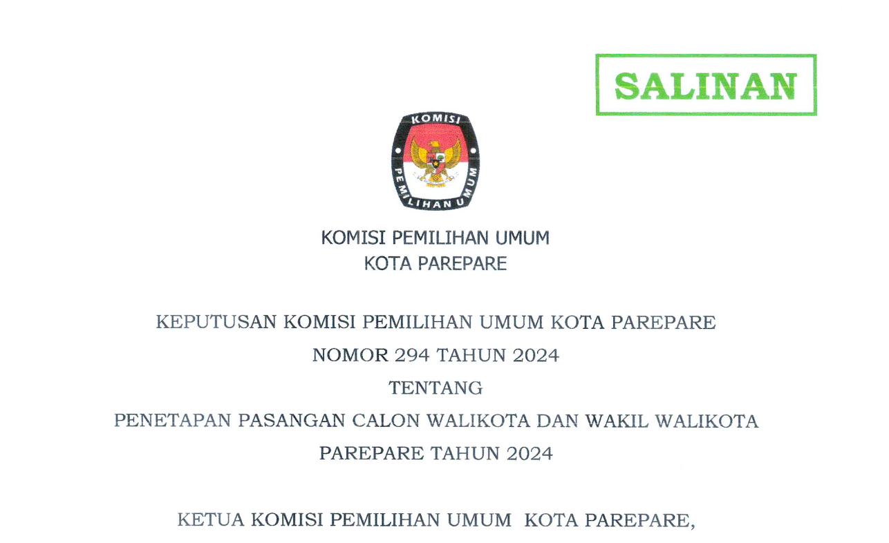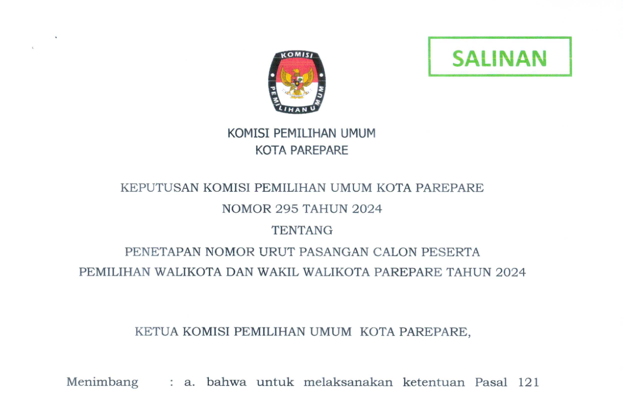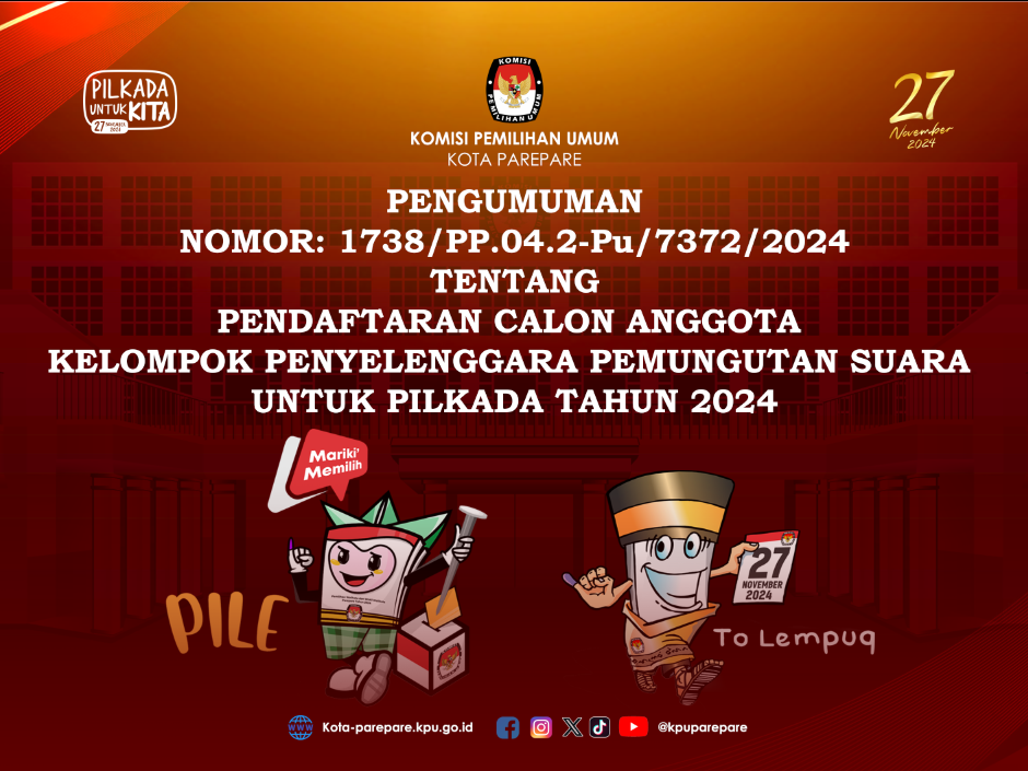 Dalam rangka pembentukan KPPS untuk Pemilihan Gubernur dan Wakil Gubernur, Bupati dan Wakil Bupati, dan Wali Kota dan Wakil Wali Kota Tahun 2024, Komisi Pemilihan Umum Kota Parepare mengundang Warga Negara Indonesia yang memenuhi persyaratan untuk mendaftarkan diri menjadi anggota KPPS untuk Pemilihan Gubernur dan Wakil Gubernur, Bupati dan Wakil Bupati, dan Wali Kota dan Wakil Wali Kota Tahun 2024, Komisi Pemilihan Umum Kota Parepare dengan ketentuan sebagai berikut: