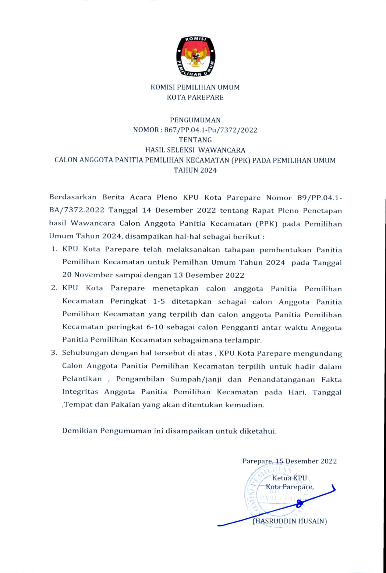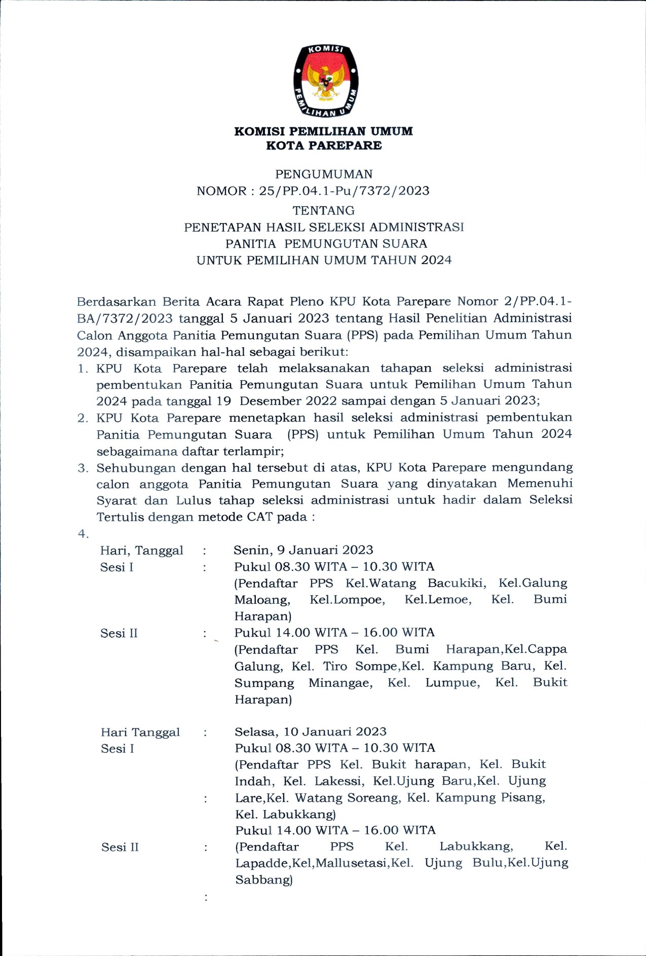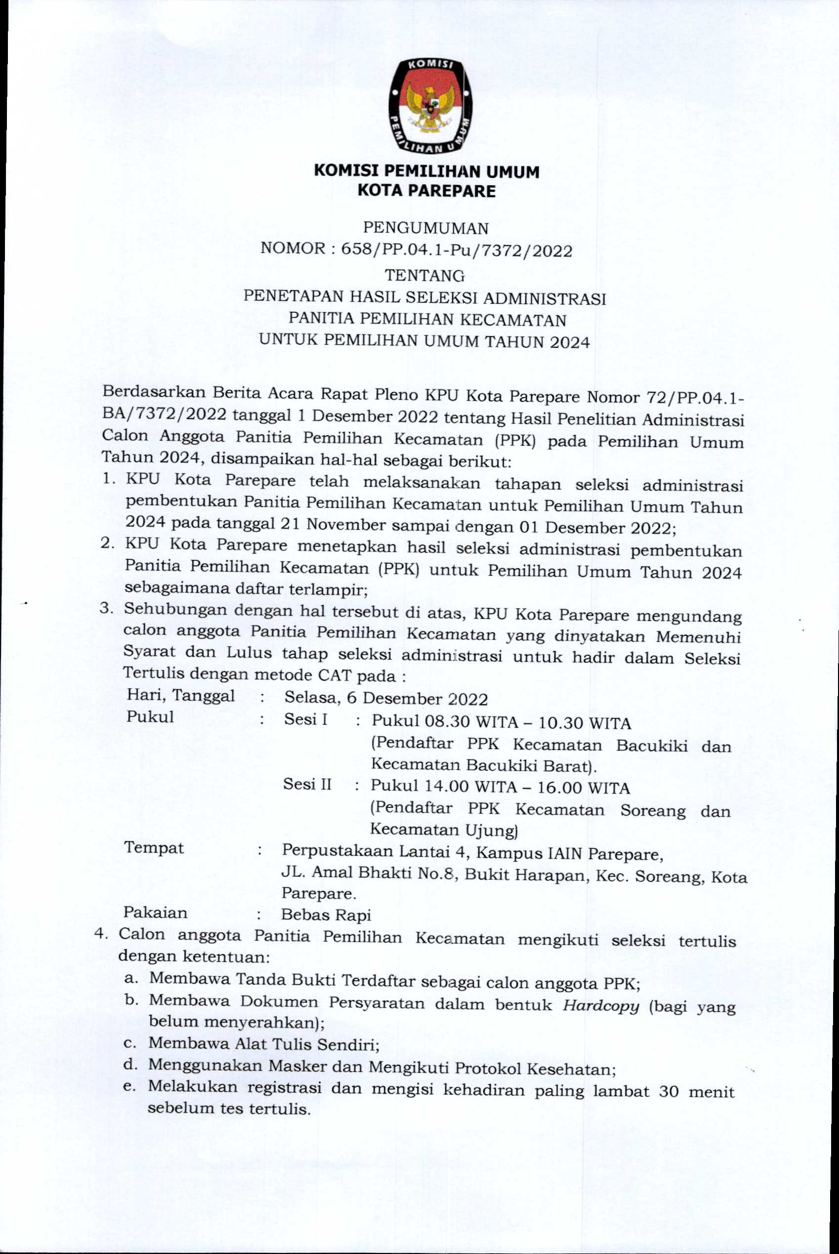 PENGUMUMAN HASIL SELEKSI ADMINISTRASI PANITIA PEMILIHAN KECAMATAN KPU KOTA PAREPARE Jumat, 02 Desember 2022 00:00 636 DOWNLOAD FILE PENGUMUMAN Baca Selengkapnya