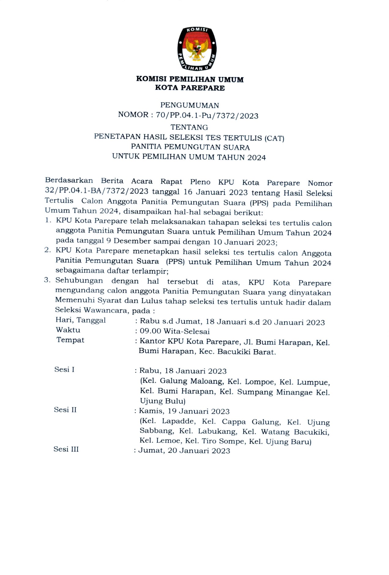 PENETAPAN HASIL SELEKSI TES TERTULIS (CAT) PANITIA PEMUNGUTAN SUARA (PPS) PEMILU 2024 KPU KOTA PAREPARE Senin, 16 Januari 2023 00:00 573 PENGUMUMAN NOMOR : 70/PP.04.1-Pu/7372/2023 PENETAPAN HASIL SELEKSI TES TERTULIS (CAT) PANITIA PEMUNGUTAN SUARA UNTUK PEMILIHAN UMUM TAHUN 2024 DOWNLOAD PENGUMUMAN Baca Selengkapnya