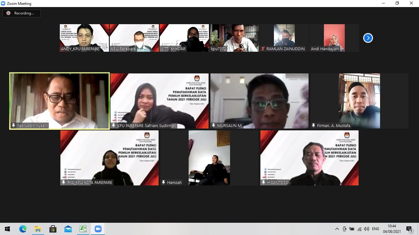 Dipandu oleh Kepala Sub Bagian Perencanaan, Data dan Informasi Sitti Kadriyah Kadir, KPU Kota Parepare laksanakan Rapat Pleno Rekapitulasi Pemutakhiran Data Pemilih Berkelanjutan Periode Bulan Juli Tahun 2021 yang dihadiri lengkap oleh seluruh Komisioner , Sekretaris, para Kepala Sub Bagian serta seluruh staf dalam lingkup KPU Kota Parepare. Rapat Pleno dibuka oleh Ketua Komisi Pemilihan Umum Kota Parepare Hasruddin Husain pada Hari Rabu, 04 Agustus 2021 Pukul 10.00 Wita berlangsung alot hingga Pukul 11.44 Wita dan diselenggarakan secara virtual. Kegiatan tersebut berhasil menetapkan jumlah pemilih sebanyak 98.658 Pemilih dengan rincian Pemilih Laki-laki 47.533 dan Pemilih Perempuan 51.125 yang tersebar di 4 (empat) kecamatan pada 22 (dua puluh dua) kelurahan. Sementara Pemilih Baru terdata sebanyak 19 (Sembilan belas) Pemilih serta Pemilih Tidak Memenuhi Syarat sebanyak 32 (tiga puluh dua) Pemilih dan tidak ada Pemilih yang melakukan Ubah Data. Data tersebut bersumber dari rekomendasi/ himbauan serta hasil pengawasan Bawaslu Kota Parepare, tanggapan dan masukan masyarakat serta temuan KPU Kota Parepare yang sebelumnya telah dikoordinasikan dengan pihak terkait. Karena berbagai keterbatasan sebagai implikasi dari masih merebaknya Pandemi Covid 19, Rapat Pleno terpaksa digelar secara virtual. Hal tersebut jelas sangat mempengaruhi kegiatan pemutakhiran, mengingat data pemilih yang berhasil dihimpun setelah melalui proses verifikasi administrasi secara internal selanjutnya harus dikoordinasikan/ dikonsolidasikan dengan berbagai pihak terkait sebelum disajikan sebagai progress capaian bulanan pemutakhiran. Kondisi ini juga membuat banyak agenda koordinasi/ konsolidasi dengan berbagai pihak terkait yang sebelumnya telah dijadwalkan juga mengalami penundaan. Akibatnya saat ini terjadi antrian data yang harus dikoordinasikan cukup menumpuk pada Subag Datin. In shaa Allah, pada bulan mendatang begitu pandemi menunjukkan tanda-tanda yang semakin membaik, data pemilih yang tersaji akan mengalami peningkatan yang signifikan. Demikian janji Mursalin Muslimin Komisioner Divisi Perencanaan, Data dan Informasi ketika dikonfirmasi via sambungan telepon. Sebelum menyudahi pembicaraan beliau juga menyampaikan penegasan dari Ketua Komisi Pemilihan Umum Kota Parepare yang meminta komitmen untuk tetap mengupayakan pelaksanaan pemutakhiran data pemilih dilakukan dengan maksimal dengan mengedepankan prinsip kecermatan, kehati-hatian dan akuntabilitas serta tetap memperhatikan penerapan prosedur kesehatan yang ketat pada setiap kegiatan pemutakhiran. Share this: